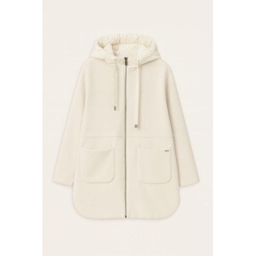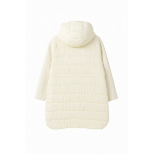 ABRIGO DE MUJER EN TONO PERLA CON DISEÑO HÍBRIDO QUE COMBINA TEJIDO SUAVE EN LA PARTE FRONTAL Y MANGAS, Y ACOLCHADO TIPO PLUMAS EN LA ESPALDA PARA MAYOR ABRIGO Y LIGEREZA.