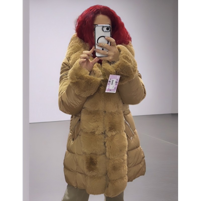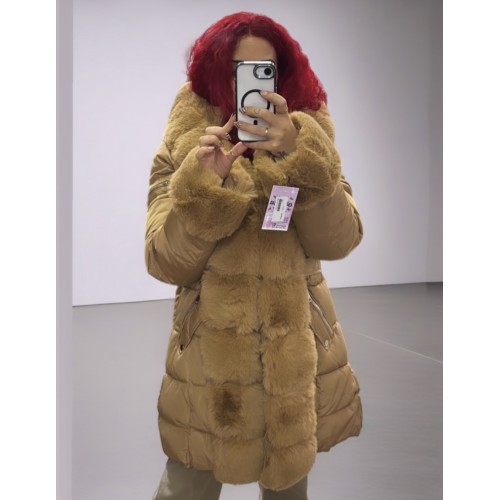 Abrigo tipo puffer overcamel, combina paneles acolchados ynlisos en mangas, laterales y parteinferior, con gruesos paneles de pelo sintetico que se pueden sacar y poner.