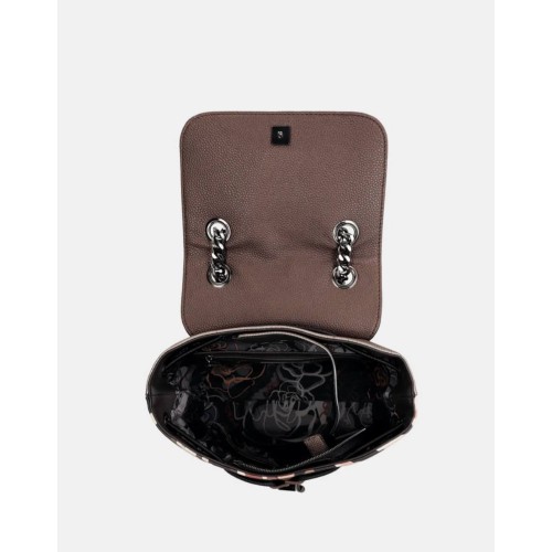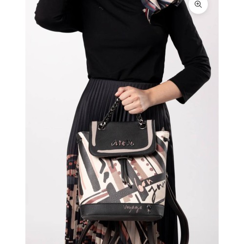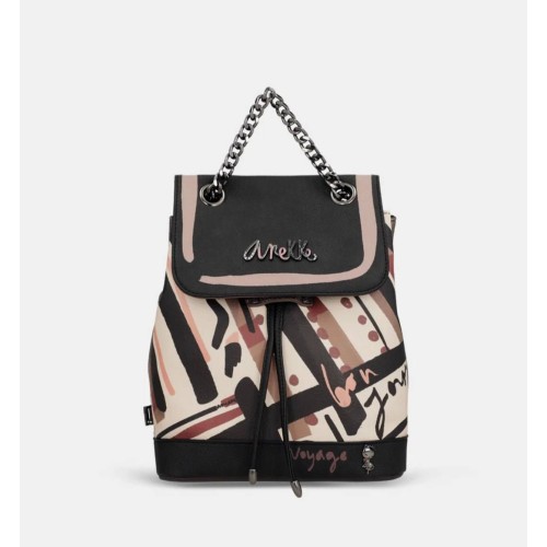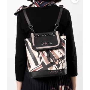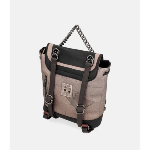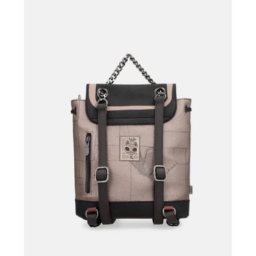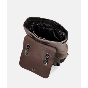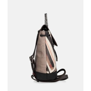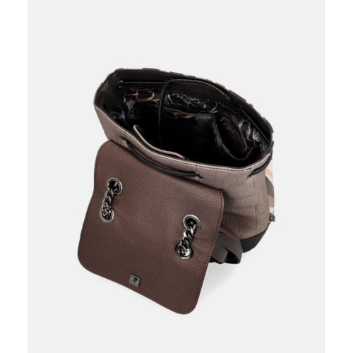 Mochila de cierre solapa además de cremallera y cordones en sintéticos efecto bombonera.