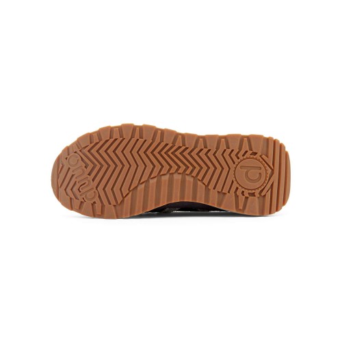 La suela de EVA y goma asegura ligereza y tracción, mientras que la plantilla, fabricada con materiales reciclados, proporciona una pisada suave y ecológica.
