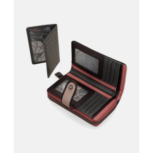 Billetera dividida en dos partes, una con cierre cremallera y con divisiones dentro y la otra de cierre con botón.