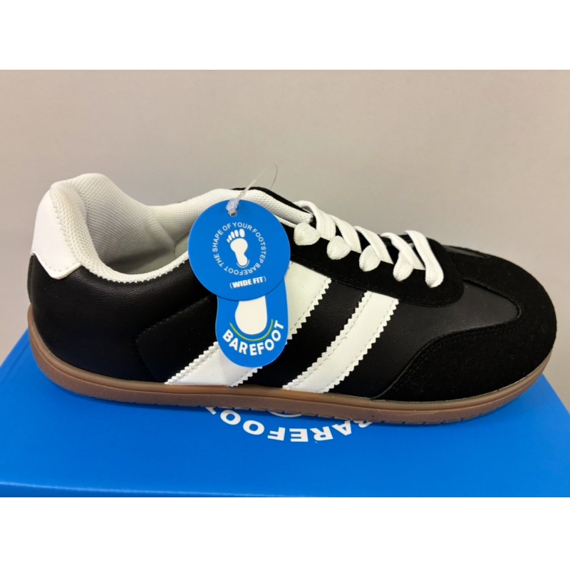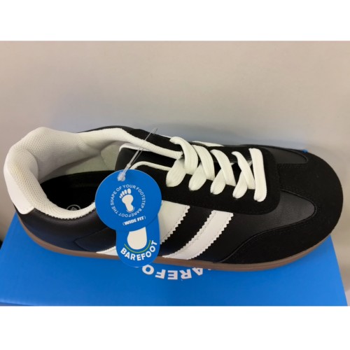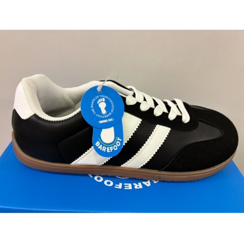 Deportivo Barefoot muy cómodo en negro con rayado en blanco y cordón .