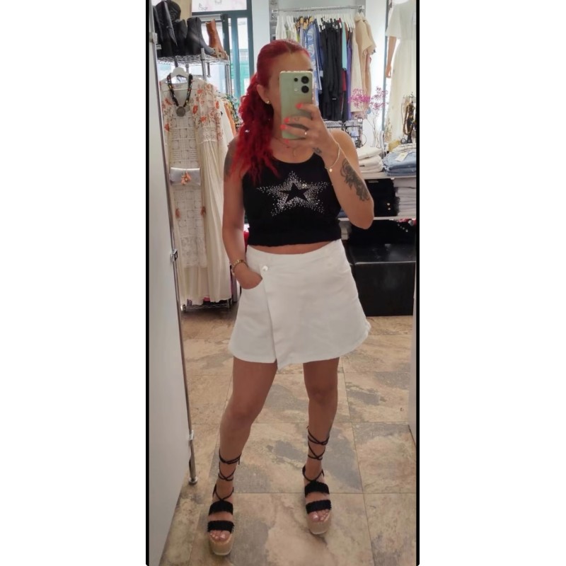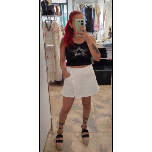 Falda vaquera blanca con cierre lateral mediante boton ; bolsillos y tejido elástico.