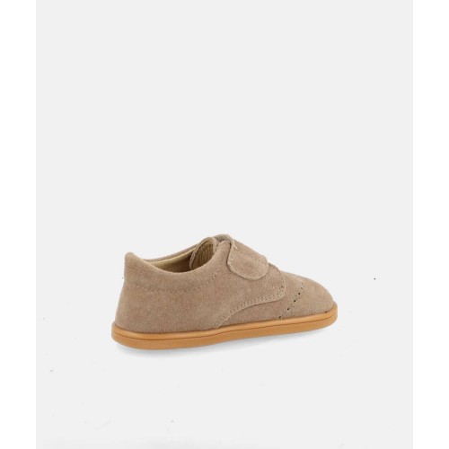 Este zapato infantil está elaborado en gamuza suave color visón, ideal para acompañar cualquier look casual o elegante. Su cierre de velcro permite un ajuste rápido y seguro, perfecto para que los niños se lo pongan fácilmente por sí mismos.