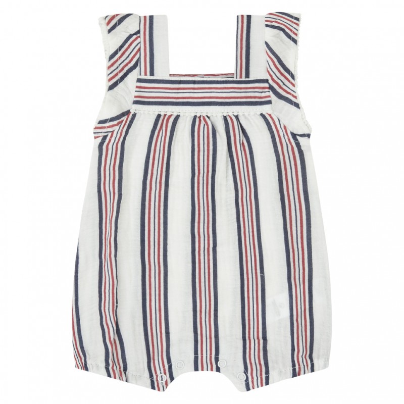 Peto corto de asas para niña, color blanco con rayas en color azul marino y rojo, abertura con botones en la espalda y con automáticos en la entrepierna. Composición: algodón 100%