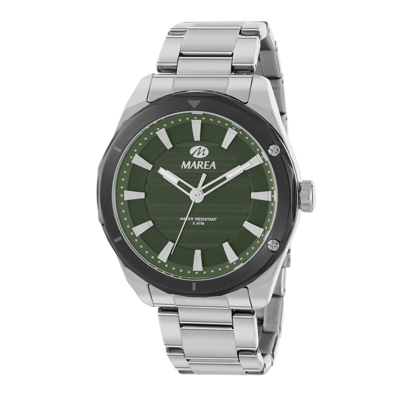 Reloj Plateado con Bisel Negro y Fondo Verde.