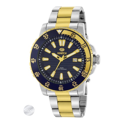 Reloj Acero Dorado con Esfera Azul y Bisel Bicolor.