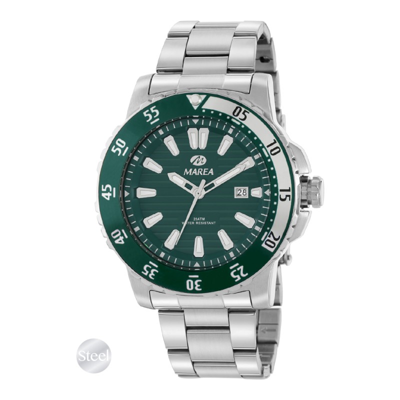 Reloj Acero Plateado con Esfera Verde y Bisel Bicolor.
