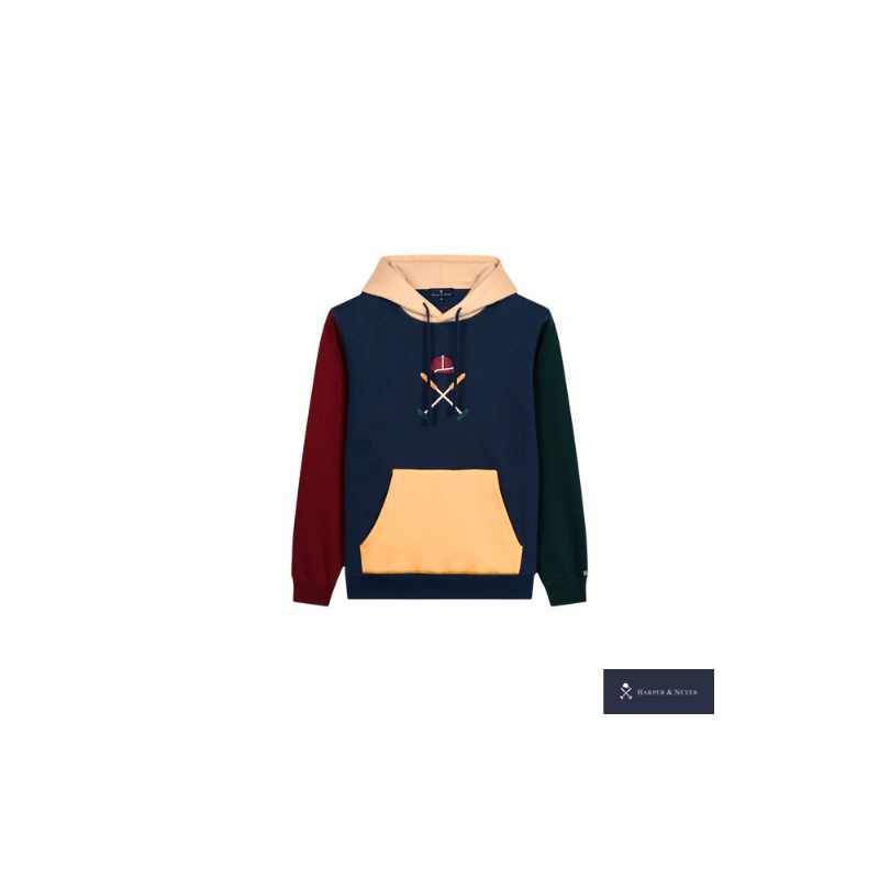 Sudadera multicolor con capucha y bolsillo canguro, confeccionada en mezcla de algodón de corte regular fit. Presenta un diseño atrevido y juvenil con paneles en contraste: cuerpo azul marino, bolsillo mostaza, manga burdeos y verde botella. La capucha en color beige y el bordado con el logo dan un toque distintivo.
