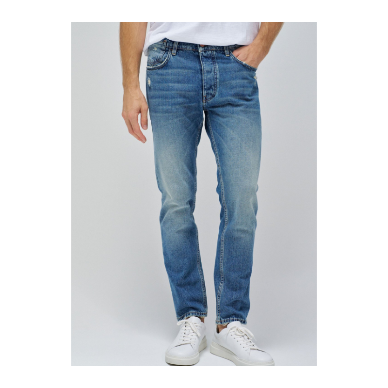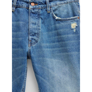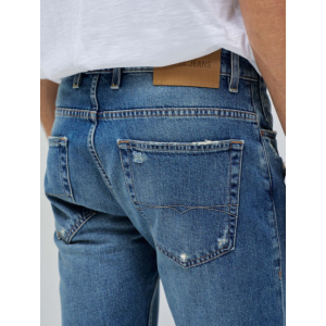 Jean Regular Fit. Color azul. Cintura media. Apertura con botones. Pierna regular. Cinco bolsillos. Con presillas. Detalle de rotos.