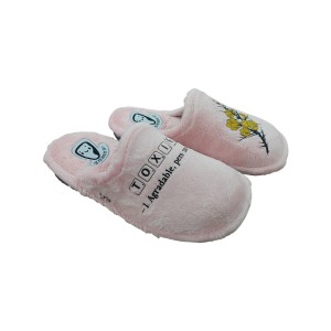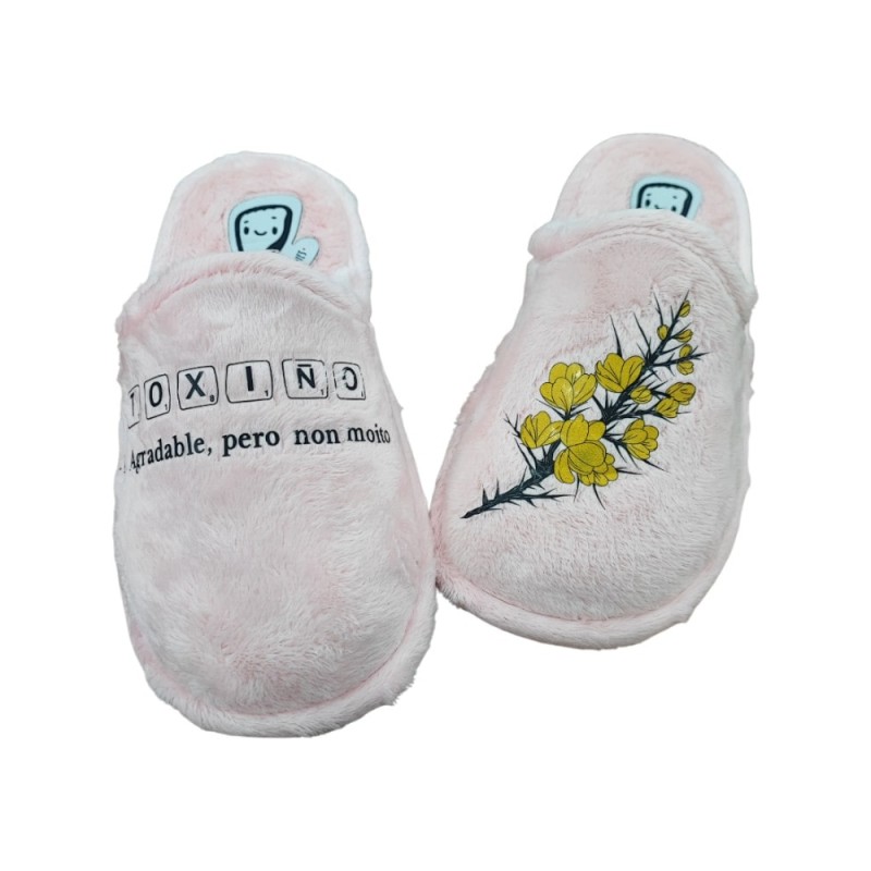Zapatilla de casa abierta por detrás con plantilla de gel y suela antideslizante, de la marca SE ME RIEN LOS PIES con frase "TOXIÑO, agradable pero non moito"