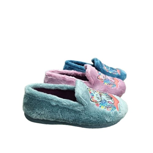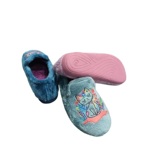 Zapatilla de casa cerrada con dibujo de gato, forrada y de textura suave. Suela de caucho