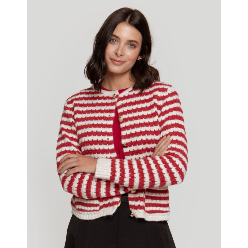 Cárdigan rayas Burdeos y crema , botones dorados y bolsillos.