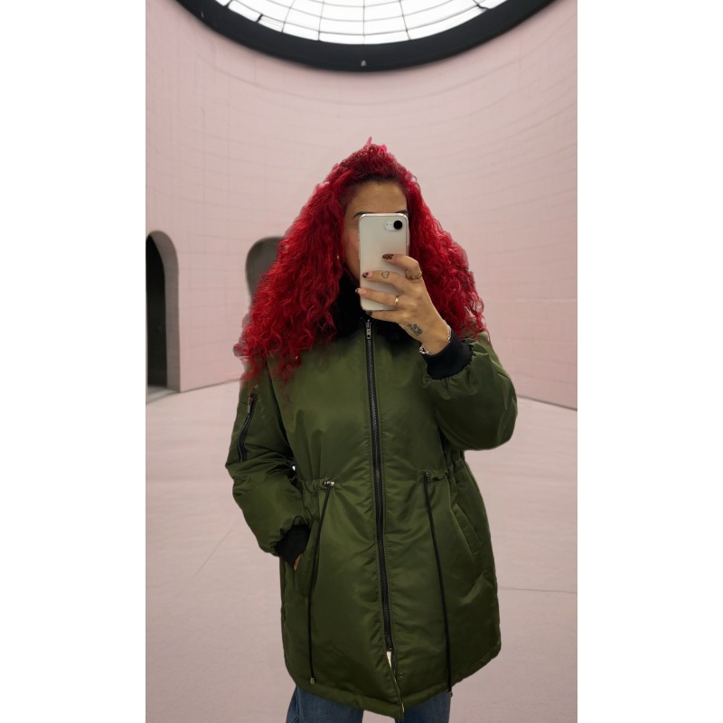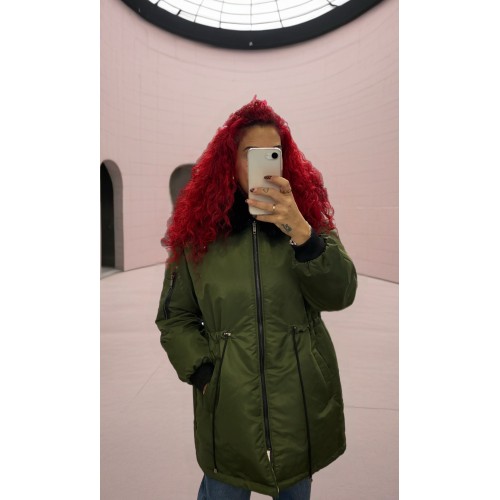 Cazadora reversible con capucha con pelo sintético; Con puños en negro y ajuste en cintura .