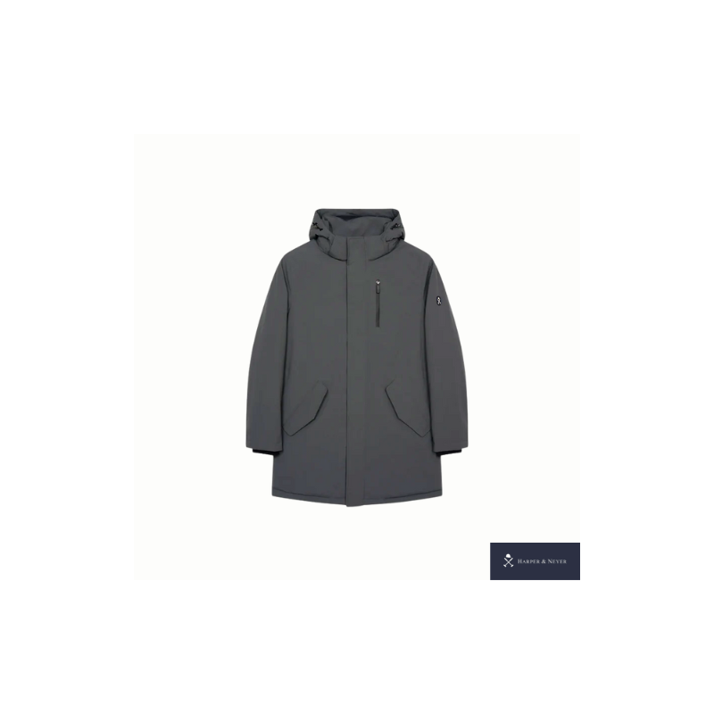 Chaqueta de corte recto y largo medio confeccionada en tejido técnico. Incluye capucha ajustable, cierre de cremallera con solapa cortavientos, bolsillos delanteros con tapeta y bolsillo vertical en el pecho. Presenta logo bordado en la manga y acabados interiores que refuerzan el aislamiento térmico.