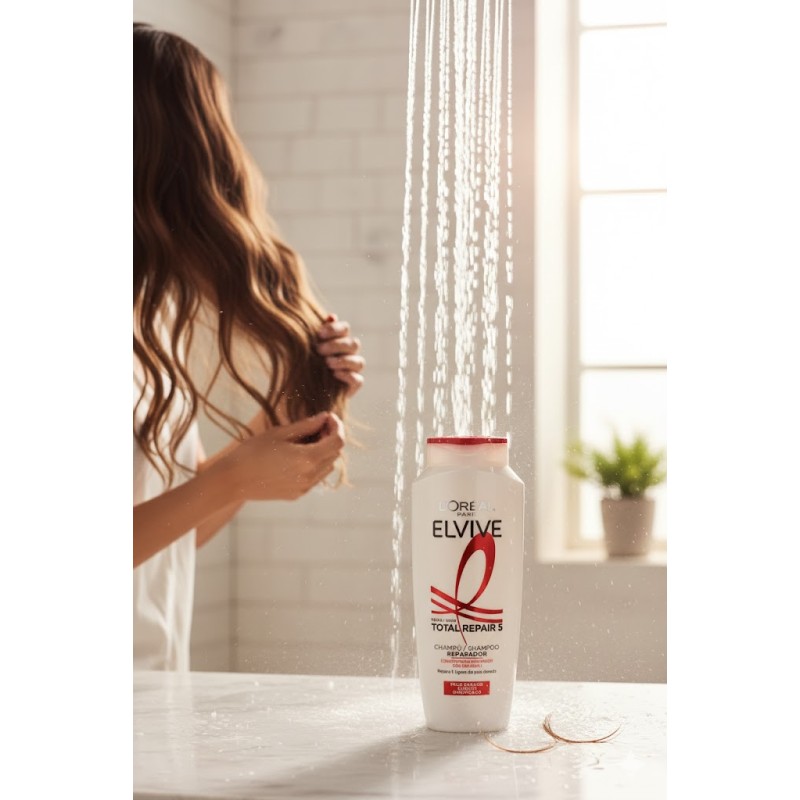 EL CHAMPÚ L'ORÉAL ELVIVE TOTAL REPAIR 5 ES LA RESPUESTA PARA QUIENES LUCHAN CONTRA LOS 5 SIGNOS DEL CABELLO DAÑADO. GRACIAS A SU FÓRMULA ENRIQUECIDA CON KERATINA XS, ESTE PRODUCTO ACTÚA PROFUNDAMENTE EN LA FIBRA CAPILAR, DEVOLVIÉNDOLE LA SALUD Y VITALIDAD PERDIDA. NO SOLO LIMPIA, SINO QUE TRATA Y REPARA CON CADA LAVADO.