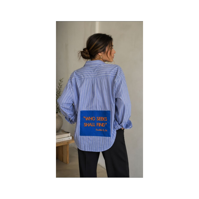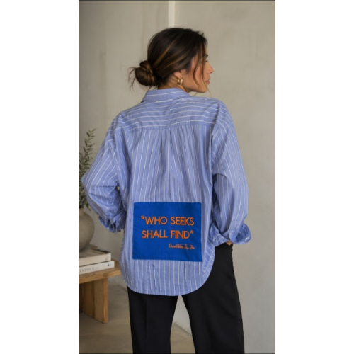 Camisa oversize de rayas tono celeste con diseño exclusivo en la espalda y mensaje inspirador. "who seeks shall find" (quien busa encontrara).
