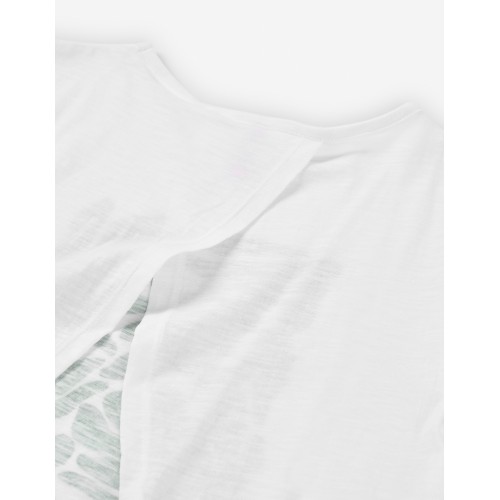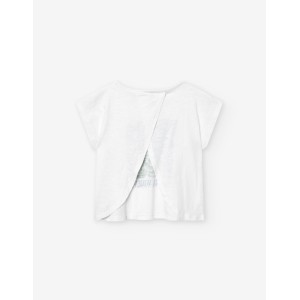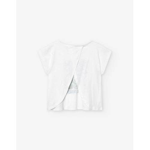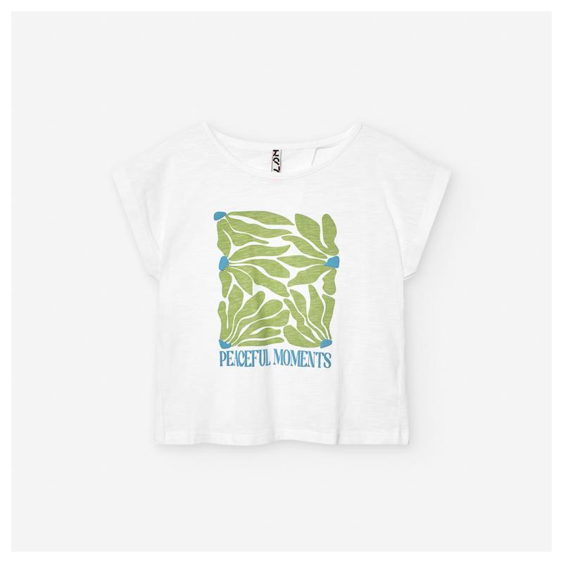 Camiseta color blanco para junior niña, manga murciélago con dibujos en verde y texto en azul.