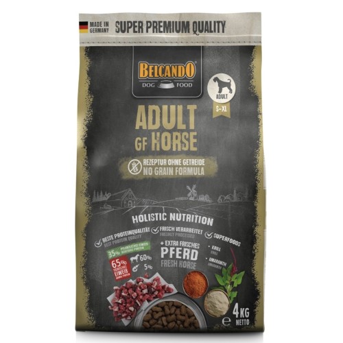 Alimento sin gluten para perros adultos con carne de caballo extra fresca, ideal para perros con intolerancias alimentarias.