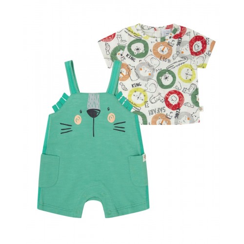 Conjunto para recién nacido niño compuesto de peto color verde claro, abertura con botones en las trabillas en la espalda, y con automáticos en la entrepierna, dos bolsillos laterales y camiseta color blanco con estampado de colores, abertura con automáticos en la espalda.