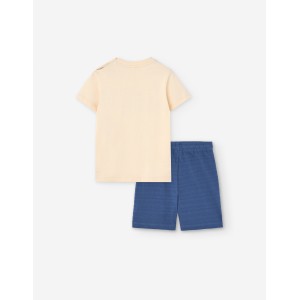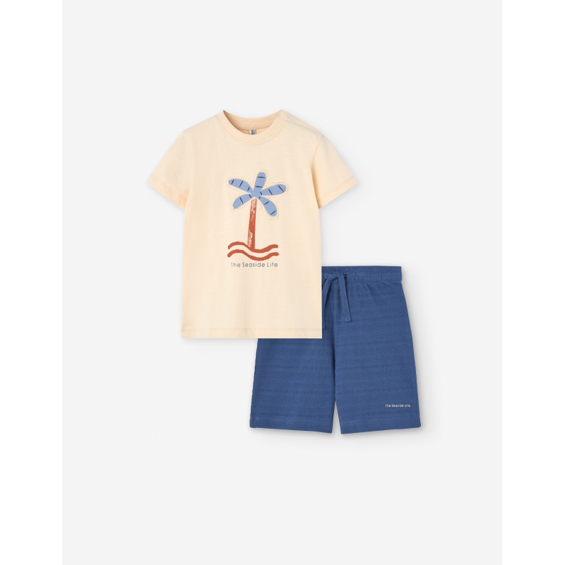 Conjunto para bebe niño compuesto de, camiseta color beige claro con dibujo de palmera en la parte delantera, abertura con automáticos en el hombro, cuello canalé, y bermuda color azul medio, goma en la cintura con cinta para atar.
