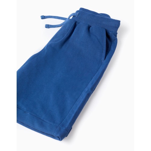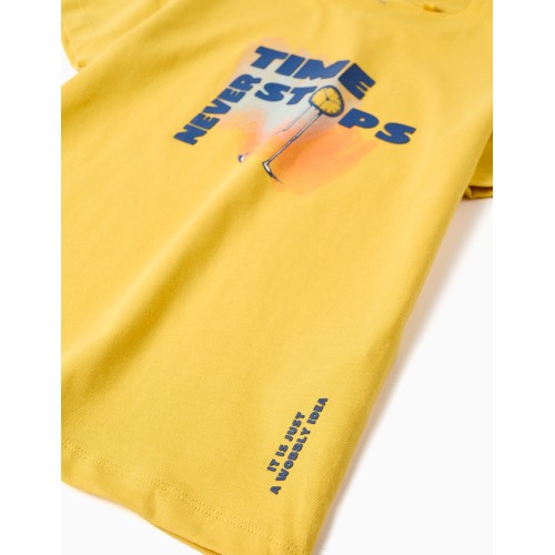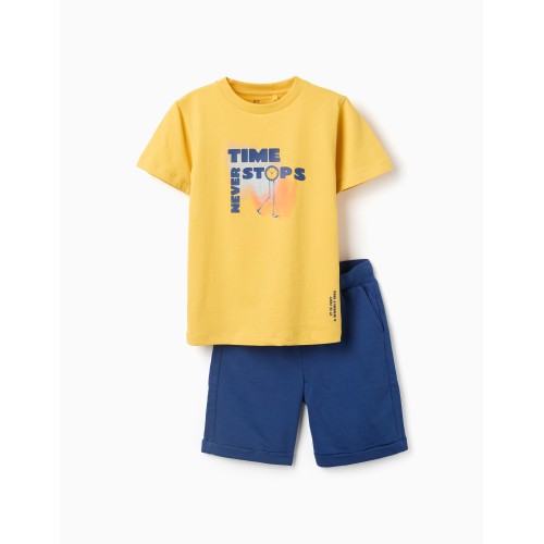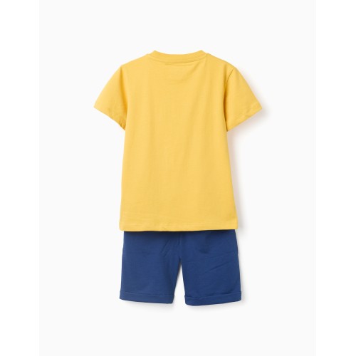 Conjunto para niño de 3 a 14 años, compuesto por camiseta manga corta color amarillo con texto y estampado en color azul, y bermuda color azul medio, goma en la cintura con cinta decorativa para atar, 2 bolsillos laterales, vueltas en los bajos.