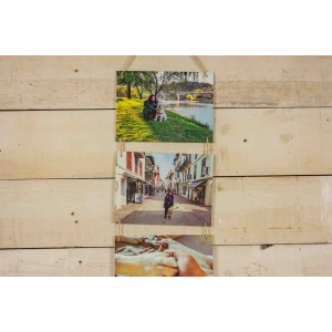 Colgador decorativo con fotos impresas en PVC y cuerda rústica.