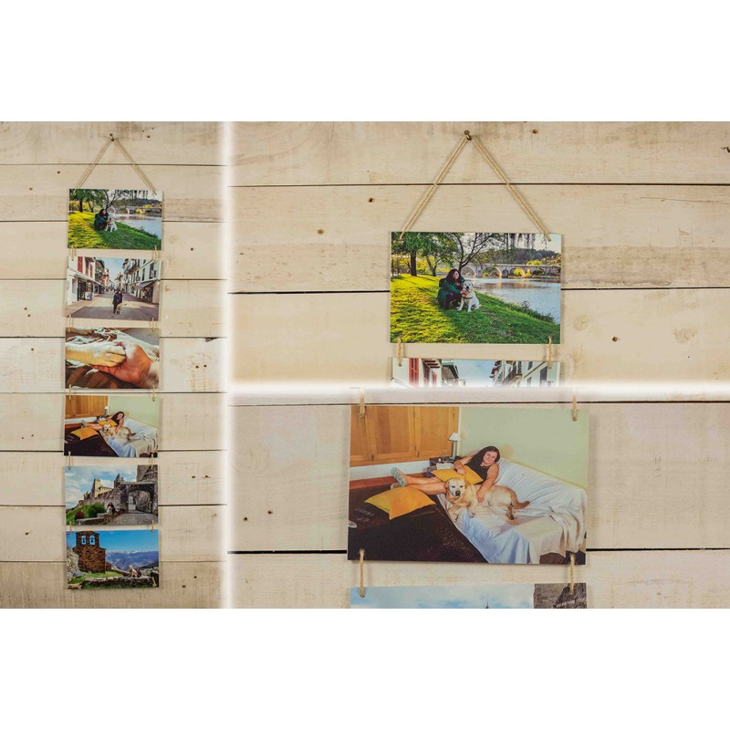 Disponible en tamaño mayor (ej. 20x30 cm) Capacidad recomendada de 3 a 6 fotos Incluye cuerda y pinzas de madera Fácil instalación Ideal para decorar salón, dormitorio u oficina con recuerdos personalizados.
