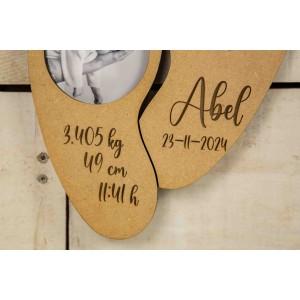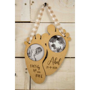 Cuadro decorativo en madera MDF natural, personalizado con nombre y datos de nacimiento del bebé. Incluye espacio para 2 fotos y grabado láser de alta precisión con diseño de pies de bebé.