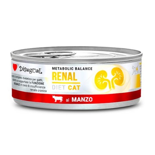 Disugual Diet Cat Renal Ternera. DIET CAT RENAL es un alimento equilibrado en cuanto al aporte de vitaminas y minerales, complementado con prebióticos (XOS y MOS) y polifenoles extraídos de Vitis vinifera. La dieta es baja en fósforo y proteína cruda de alta calidad para apoyar la función renal. También contiene aceite de salmón, una fuente natural de valiosos ácidos grasos omega-3.