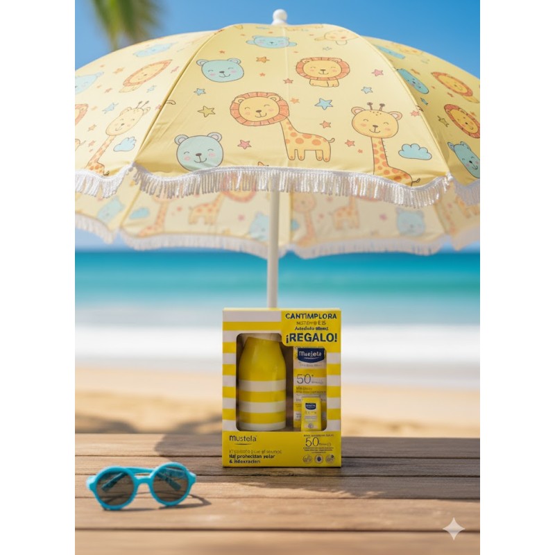 TODO TIPO DE PIEL INCLUSO INTOLERANTE AL SOL O ATOPICA Y EMBARAZADAS, CONTIENE LECHE SOLAR SPF+50 100ML, STICK SOLAR SPF50 9ML Y CANTIMPLORA SOSTENIBLE DE ALUMINIO 650ML