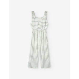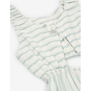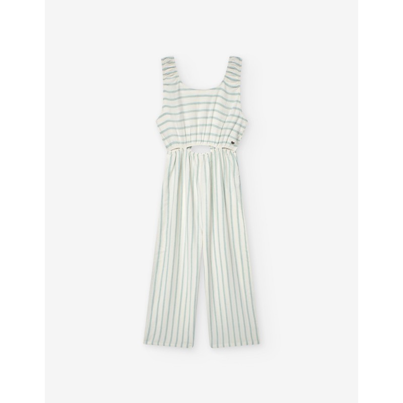 Mono largo para junior niña, color blanco roto con rayas en color verde claro, horizontales en la parte superior y verticales en la inferior, aberturas en la cintura con gomas, abertura en la espalda con botón, gomas en los hombros. Composición: viscosa 55%, lino 45%