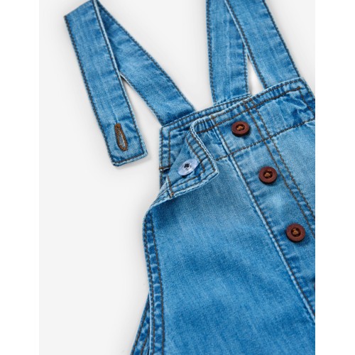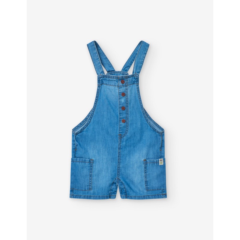 Peto vaquero para bebe niño color azul, abertura con tirantes con botones en la parte delantera y en los laterales y en la entre pierna con automáticos, 2 bolsillos delanteros.