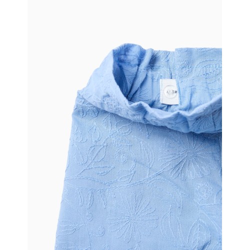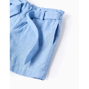Short para niña de 3 a 14 años, tejido bordado en color azul claro, cinta ancha para atar en la parte delantera, goma en la cintura con cinta ajustadora interior, con forro.
