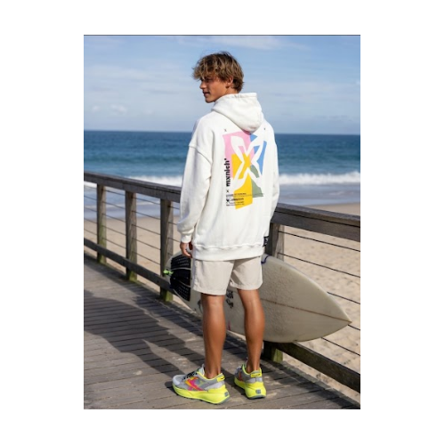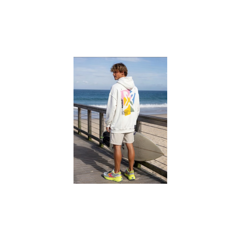 Esta sudadera de estilo streetwear en color blanco destaca por su cómodo corte oversize y un vibrante diseño gráfico en la espalda que aporta un aire juvenil y moderno.