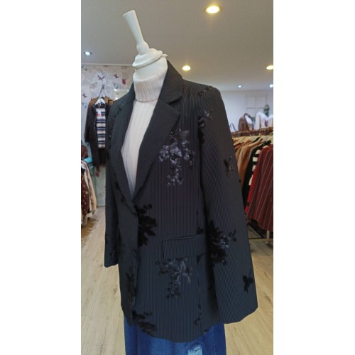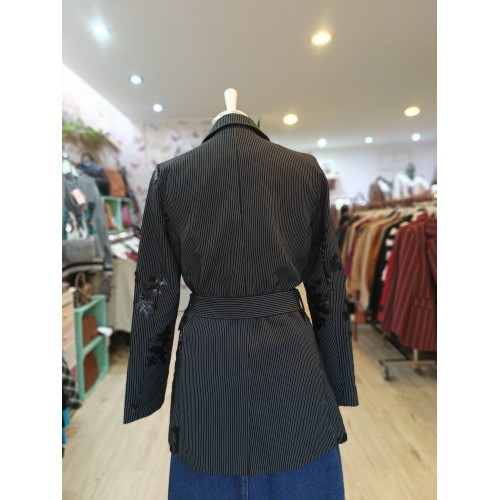 Blazer negra para mujer con estampado de rayas finas en color blanco.