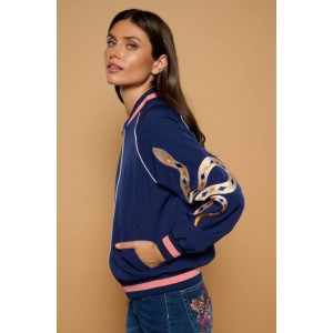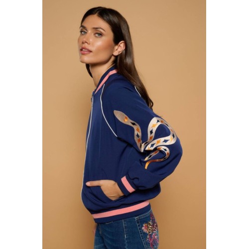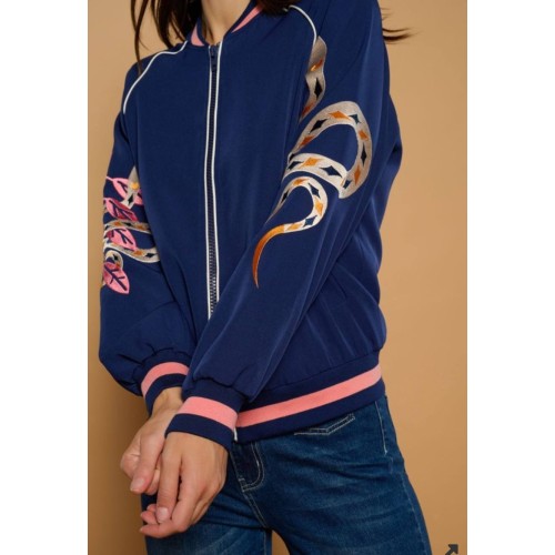 Bordados en ambas mangas, en una, una serpiente rodeada de motivos astrales ( estrellas y diamantes ), y en la otra, una composición botánica de serpiente y flores en tonos rosas y ocres.