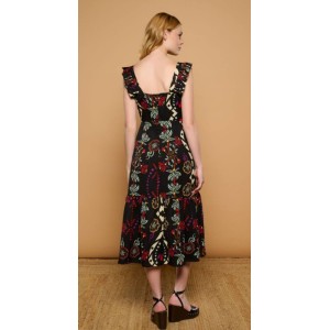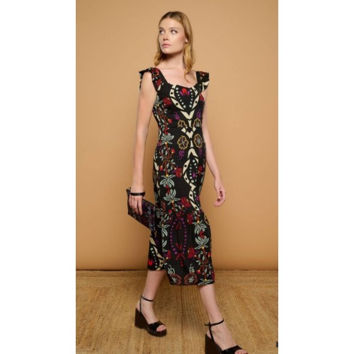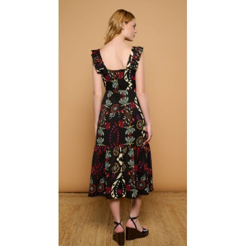 Vestido midi color negro de escote cuadrado y corte evasé.