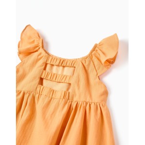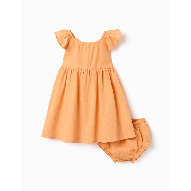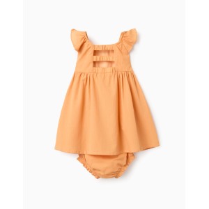 Vestido para bebé niña de 6-9 a 36 meses, color amarillo medio con goma en el cuello y en la espalda con trabillas, tejido con dibujo cuadritos, frunce debajo del pecho, con braguita forrada.