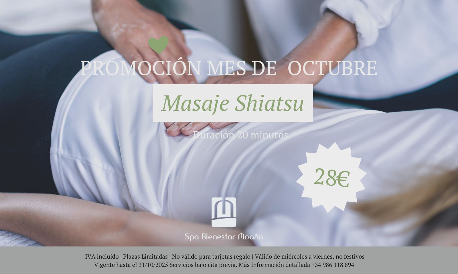 De mércores a venres, durante o mes de outubro. A masaxe shiatsu en promoción. O shiatsu é unha técnica de masaxe xaponesa que utiliza presións coas mans e dedos, sobre puntos específicos do corpo para mellorar o equilibrio enerxético, aliviar tensións e favorecer o benestar físico e emocional. Está baseada nos principios da medicina tradicional chinesa.